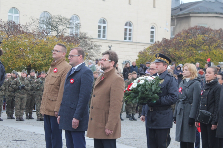 Goście i organizatorzy Święta Niepodległości,  nadający ton rocznicowej uroczystości , kontynuowanej na Rynku przy Pomniku Czynu Legionów Józefa Piłsudskiego,  akcentowali